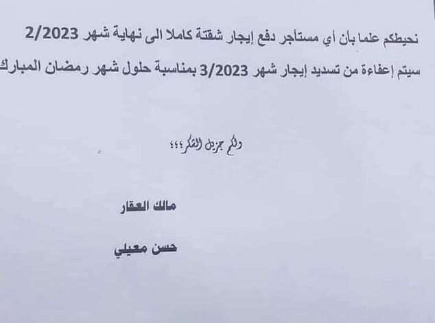 وقال  معيلي في إعلان له  ان الإعفاء من ايجار شهر يأتي بمناسبة شهر رمضان المبارك.