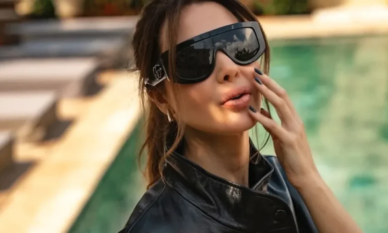 أما الكندرة، فأتت بتصميم (Slingback) الكلاسيكي باللونين الأزرق الفاتح والأسود، في خطوة أضفت أنوثة واضحة ووازنت بين قوّة الجلد ورقّة الكعب العالي. واكتملت الإطلالة بنظارة شمسية سوداء ضخمة بتوقيع علامة “غوتشي” (Gucci) انسجمت مع الروح العصرية للوك.