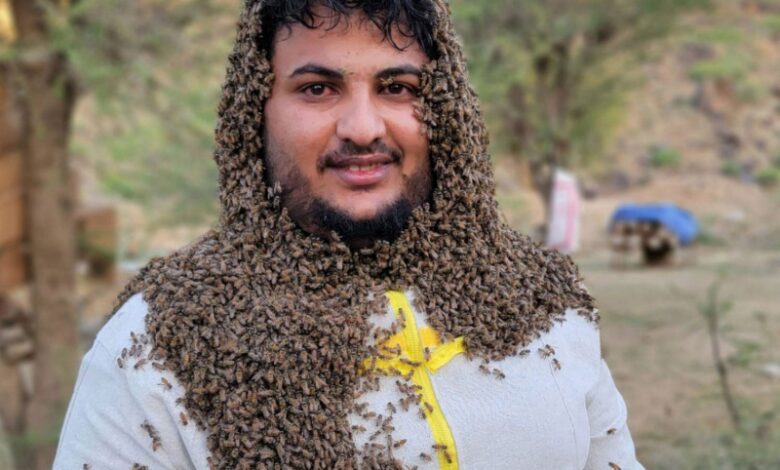 نشر النحال اليمني عبدالجبار الغولي على مواقع التواصل الاجتماعي مقطع فيديو وهو يغطي وجهه ورأسه بالآلاف من النحل.