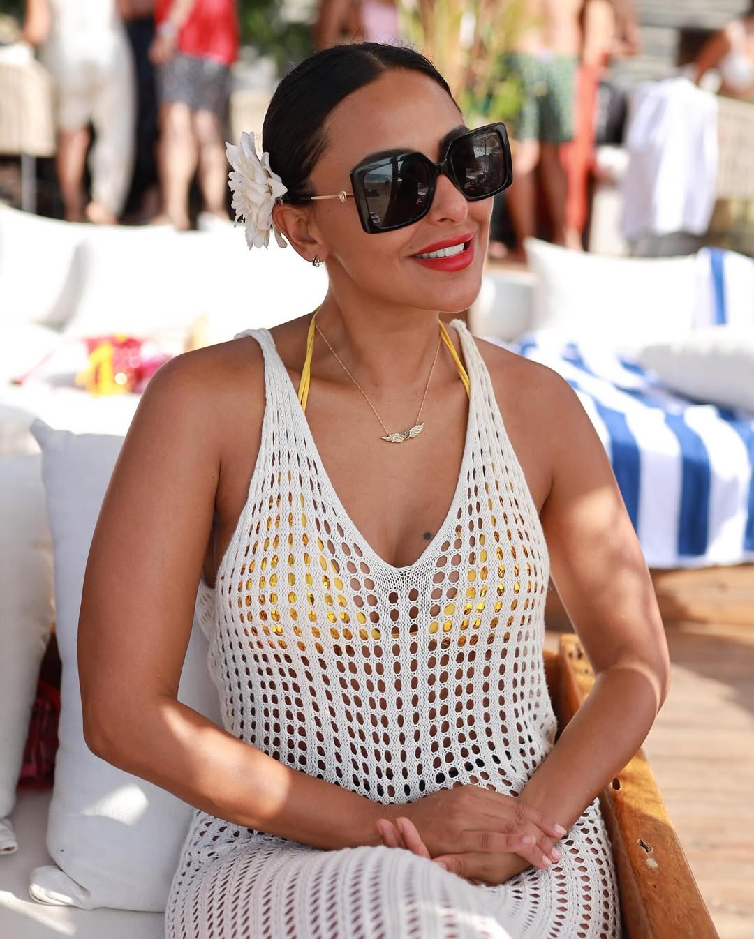 أما ميس حمدان، فاختارت فستان بحر مشبك باللون الأبيض، بقصة طويلة تبرز جمال قوامها وتناسب أجواء الشاطئ. وقد بدا أنها ترتدي تحته لباس سباحة باللون الأصفر، ما أضفى لمسة مرحة ومشرقة على الإطلالة. واختارت تسريحة شعر مشدودة إلى الوراء، وزيّنتها بوردة على أحد الجانبين، في لمسة رومانسية أنثوية. كما نسقت نظارات شمسية عريضة بارزة أكملت بها هذا اللوك الصيفي الساحر.