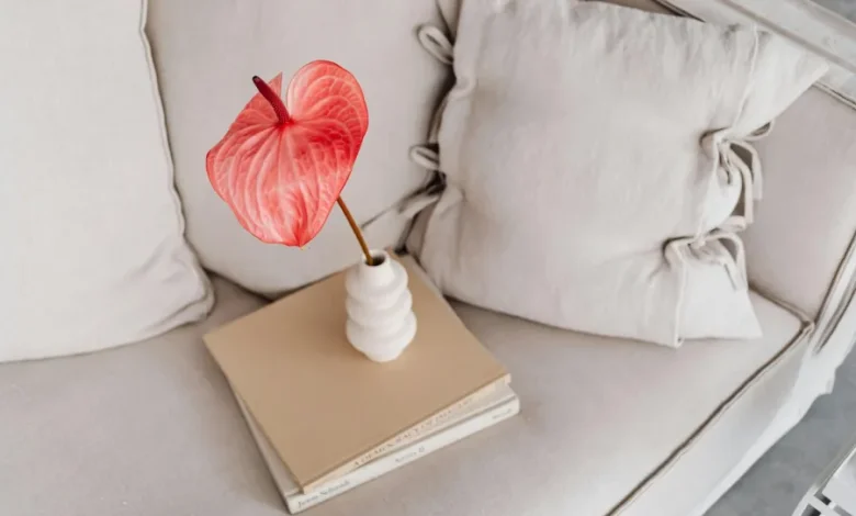 نبات الأنثوريوم: هو معروف أيضاً باسم زنبق الفلامنغو، و يُعدّ نباتاً لافتاً للأنظار بأوراقه الخضر اللامعة وأزهاره الحمر المُنتصبة اللافتة التي تُبرز ثمرته الصفراء البرتقالية. يحتاج هذا النبات سهل النمو إلى مكان يحظى بكم جيد من ضوء الشمس لإنتاج الكثير من الأزهار، إضافة إلى التسميد المنتظم (كل أسبوعين).