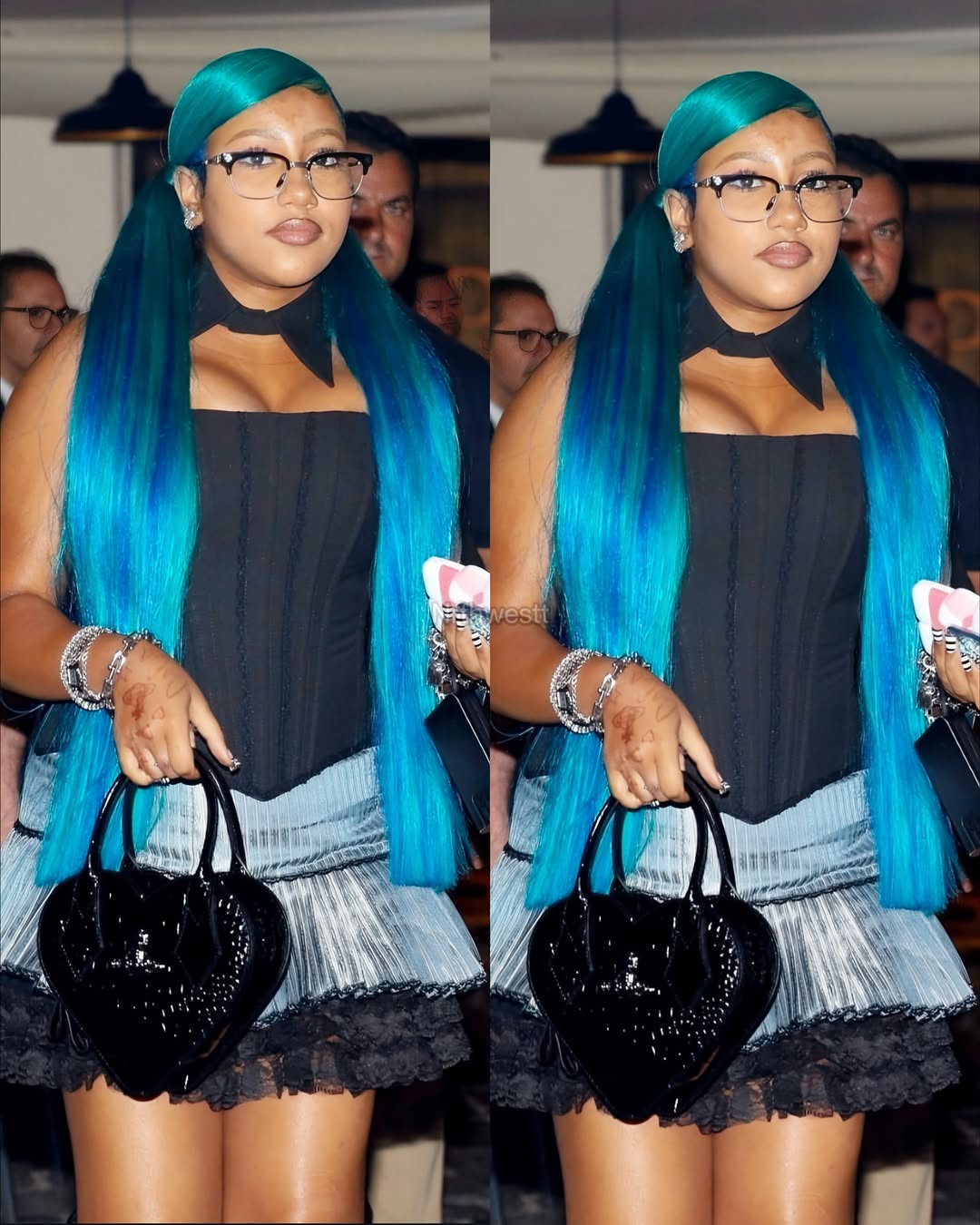 وظهرت ابنة مغني الراب كانييه ويست بعدما كبرت وباتت بملامح مختلفة، وهي ترتدي ملابس ضيقة عبارة عن كورسيه أسود من دون أكمام بتصميم يناسب الكبار مع حركة قبة القميص باللون الأسود، ونسقت معه تنورة قصيرة جداً من الجينز بكشاكش ودانتيل أسود يزين اطرافها.