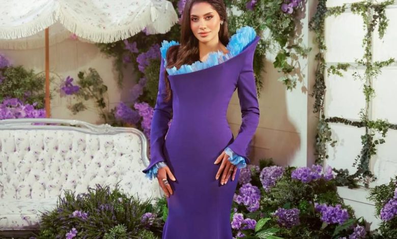 اختارت النجمة السعودية فستاناً مبهراً لناحية التصميم والألوان في إطلالة مميزة تجمع بين الفخامة وجرأة الألوان، وحمل توقيع المصمّم اللبناني فؤاد سركيس. تميز الفستان بلونه البنفسجي الغامق مع لمسات من اللون الأزرق (البيبي بلو) على أطراف الأكمام والياقة، وهو ما أضاف مزيجاً جميلاً يناسب المكان الذي اختارته لتوثيق هذه اللحظات.