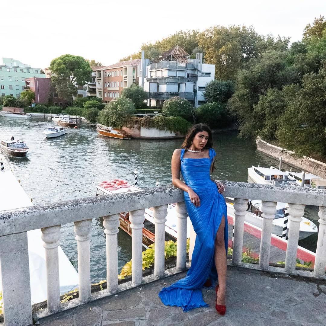 وكذلك تألقت ليلى عبد الله بفستان باللون الأزرق النيلي خلال رحلة لها بالقارب في البندقية الساحرة، واختارت فستاناً مميّزاً بتصميم ضيق بالكامل مع حمالات عريضة، وتميّز بقصّة الثنيات الرقيقة التي زينت القماش، لينسدل بتنورة واسعة من الأسفل مع فتحة جانبية واسعة عند الساق.