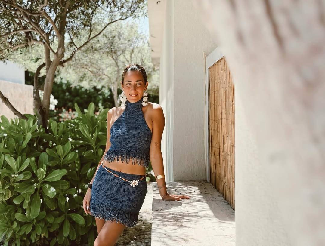 أمينة خليل تتألق بإطلالة صيفية بالشراريب بطقم كحلي أنيق