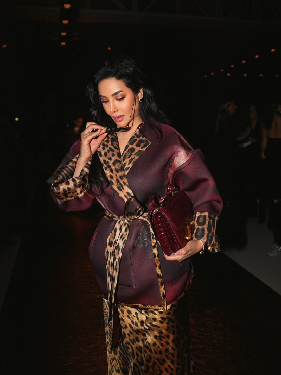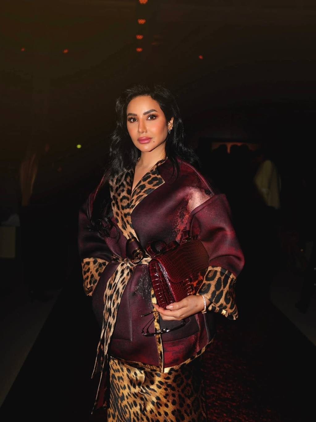وتألقت الإعلامية السعودية بإطلالة شتوية محتشمة وأنيقة عبارة عن فستان طويل بتصميم واسع ومريح بنقشة الفهد الجميلة، ونسّقت معه معطفاً متوسط الطول باللون العنابي بقماش لامع وبقبّة وأكمام واسعة مزيّنة عند الأطراف بقماش بنقشة الفهد، مع حزام من النقشة نفسها، والتي تبعث شعوراً بالفخامة وقوة الحضور.