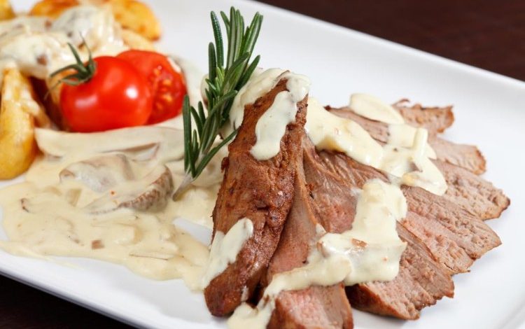 ضعي شرائح اللحم في صحن التقديم، وغطيها بالصوص الأبيض، وقدميه فوراً.