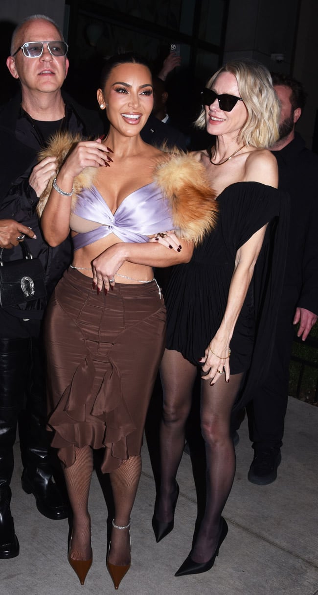 وأما بالنسبة الى بلوزتها، فقد ارتدت كيم حمّالة صدر حريرية بلون أرجواني فاتح، مصمّمة بطريقة ملتفّة ومربوطة كشريط. وكان شالها المصنوع من الفرو البنّي الفاتح هو القطعة الأبرز، على الرغم من أن مجوهراتها الماسية كانت لافتة للنظر بالقدر نفسه. حول معصمها وكاحلها وحتى خصرها، أضافت سلاسل برّاقة المزيد من اللمعان.