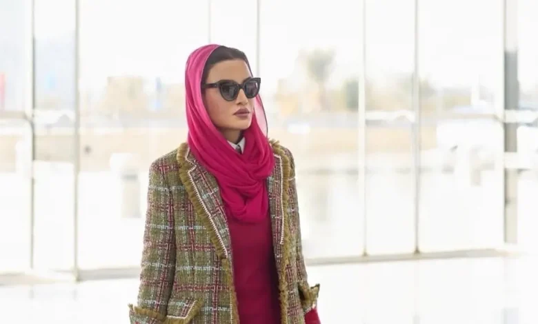 ونسّقت الشيخة المعطف مع فستان جريء باللون الفوشيا وحجاب متناسق، لتكتمل الإطلالة بحقيبة صغيرة باللون الأخضر الزيتوني من (Fend ) بنقشة التمساح تظهر بشكل متقطّع، ما منح اللوك بعداً أنيقاً وعصرياً على الإطلالة بالكامل.