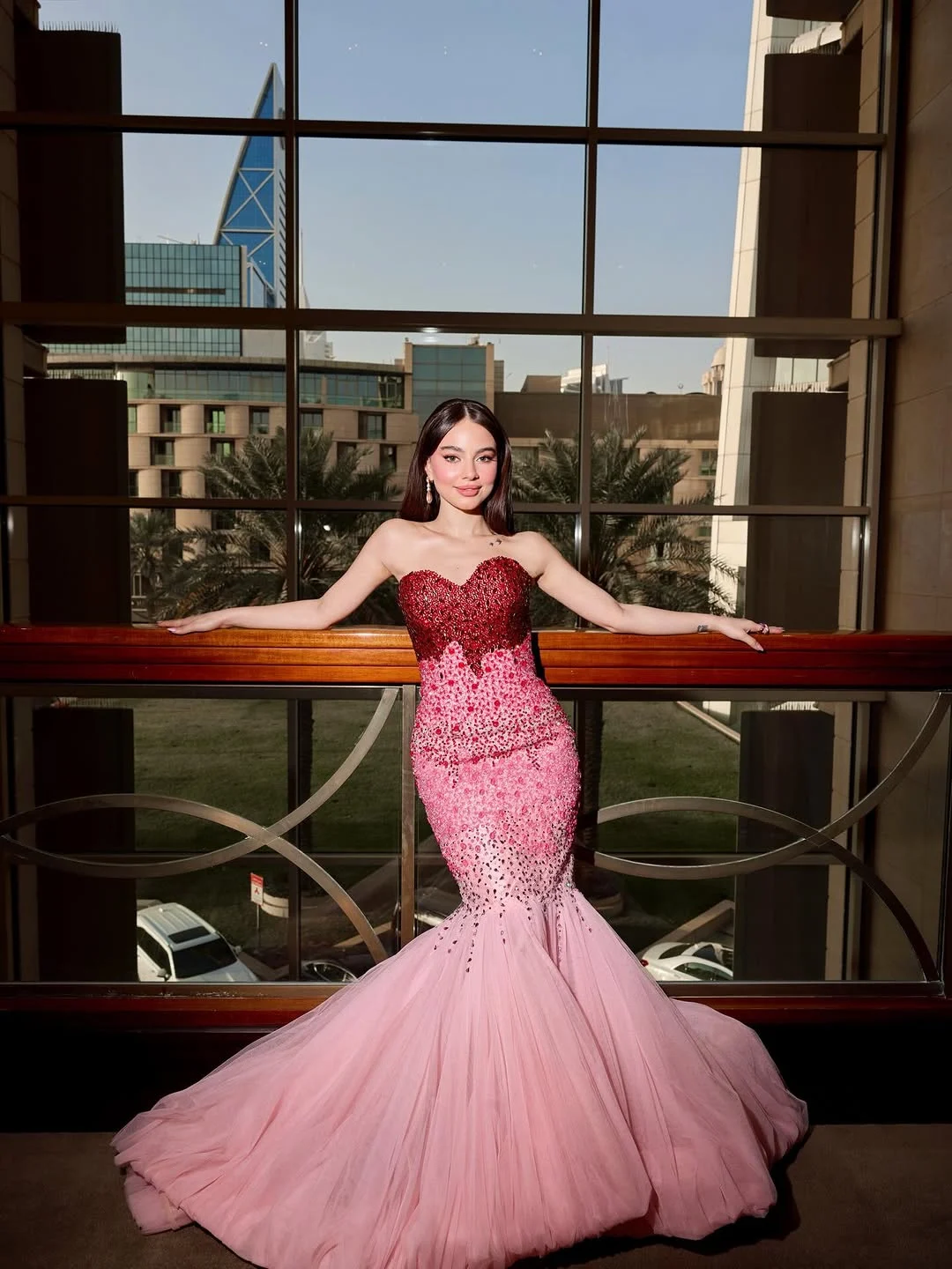 ومشت الشابة السورية على السجادة الخزامية بفستان مميّز اختارته من دار الأزياء الفاخرة في دبي Designers & Us وتميّز بتصميمه العصري والشبابي الذي يجمع بين حرفية الشك والأناقة الكلاسيكية، وجاء ضيق من الأعلى ومن دون أكمام وبفتحة قلب مع رسمة مطرزة بالكامل عند منطقة الصدر على شكر قلب كبير بحبيبات كريستالية باللون الأحمر وينسدل بشكل مستقيم باللون الزهري الناعم ومزين بشك بحبيبات باللون الأحمر في حركة أضافت المزيد من الفخامة الى اطلالتها.