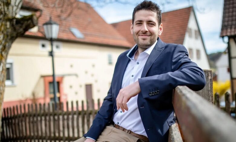 يؤدي السوري ريان الشبل (29 عاما) اليمين الدستورية لتولي منصب عمدة بلدة أوستلسهايم الألمانية، الواقعة شمالي الغابة السوداء، مساء اليوم الجمعة، خلال اجتماع احتفالي لمجلس البلدة.
