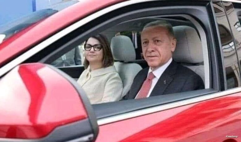 والتقطت هذه الصورة خلال استلام الرئيس التركي سيارة محلية الصنع في القصر الرئاسي، ويمكن مشاهدة لقطات أخرى تظهر أردوغان وزوجته خلال قيادة السيارة.